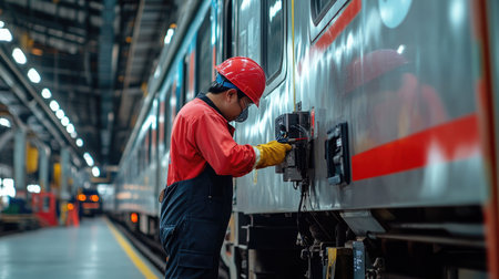 A worker in a hard hat uses advanced diagnostic tools for maintenance on a train in an industrial setting, ensuring high efficiency and safety in operations.