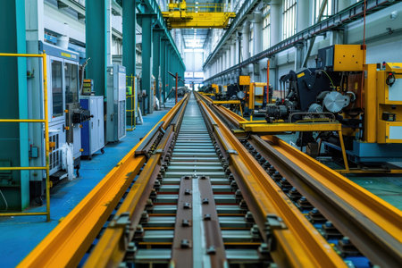 This photo captures the vast interior of an industrial warehouse featuring railway tracks, overhead cranes, and vibrant lighting, showcasing a busy manufacturing environment.