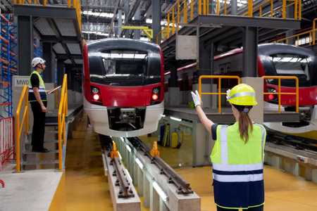Young caucasian engineer woman or worker signal while engineer man checking electric train for planning maintenance in station, transport and infrastructure, inspector check service transport.
