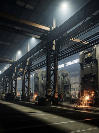 The interior of a large industrial factory with massive machinery, beams, and bright sparks flying from metalworking operations.