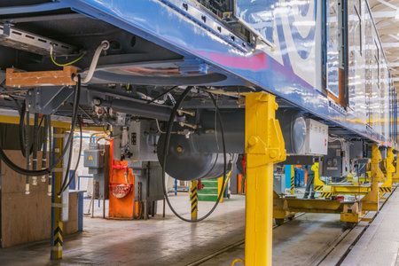 repair of tram in depot. garage equipped for service and repair of public transport