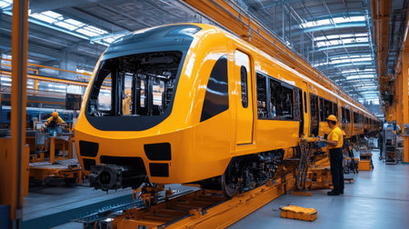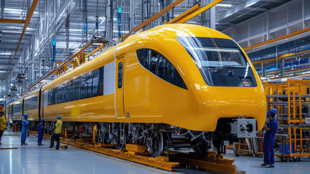 A vibrant manufacturing facility showcasing the assembly of a modern train. Skilled workers engage with advanced machinery to reflect innovation in the transportation industry.
