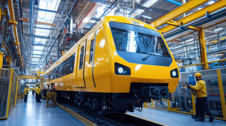 A vibrant yellow train stands at the forefront of a modern manufacturing facility. The scene showcases advanced machinery and an organized assembly process.