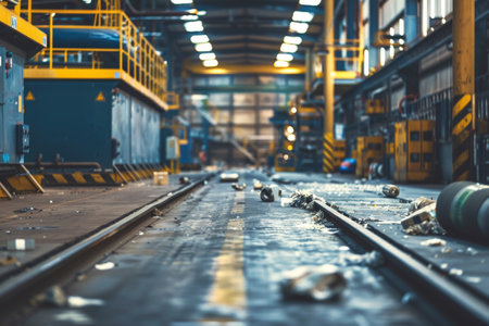 That the image is generated using AI. Rusty steel rails in abandoned industrial warehouse.