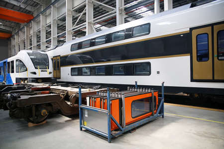 Inside the carriage assembly plant. Production workshop for the production of high-speed trains. Plant for the production of rolling stock of trains.