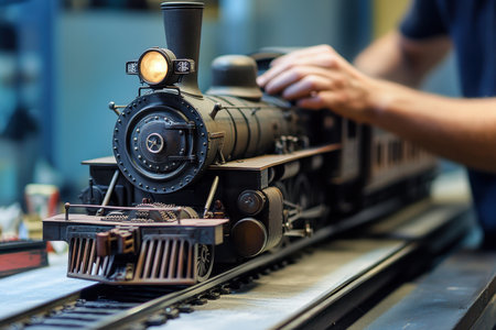 A person works on assembling a detailed model steam locomotive in a well-lit workshop setting.