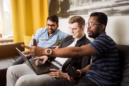 Group of multiethnic male friends watching online sport game using laptop sitting on sofa at home, waiting for victory after betting in online bookmaker. Business, betting, technology concept.