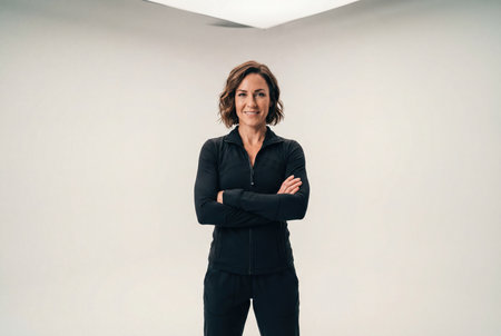 A confident fit woman with short brunette hair stands facing the camera with her arms crossed while wearing a sleek black track jacket and pants against a clean white studio background.