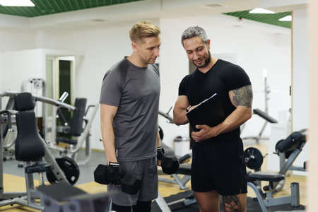 Fit man discussing workout plan with his trainer, personal coach before starting workout in the gym. Personal coach standing near young man and showing something on his clipboard