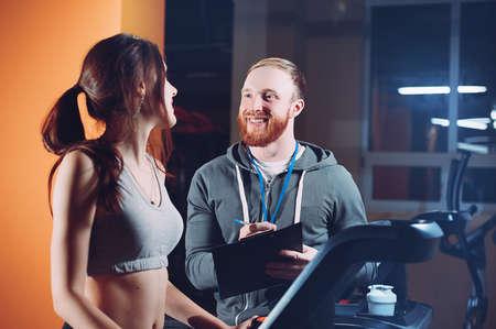 coach teaches young girl on the treadmill. coaching