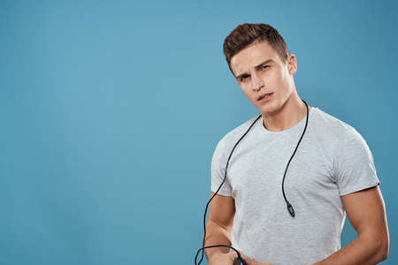 Portrait beautiful young Asian woman in sportswear blue color with jump rope after exercise and looking to forward on web banner grey background.