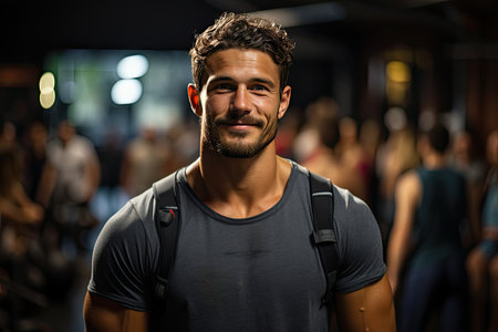 Smiling student stretches after intense training, surrounded by colleagues and gym equipment., generative AI