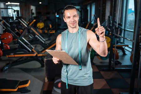 young cheerful personal trainer in gym and with clipboard and stopwatch