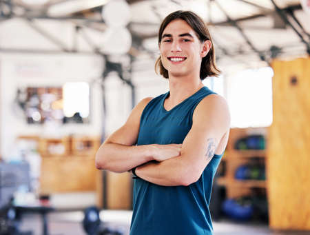 Portrait of one confident young strong caucasian man standing with his arms crossed ready for training in a gym. Happy guy smiling while working as a trainer and instructor in a fitness centre