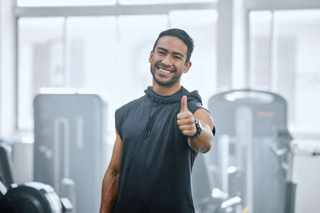 Portrait of smiling trainer alone in gym, showing thumbs up sign and symbol. Asian coach endorsing support after workout in exercise health club. Young happy man in fitness centre for routine training