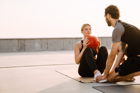 Young man and woman working out with medicine ball together on parking outdoors