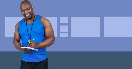 Digital composite of Fitness trainer man with minimal shapes writing on chart
