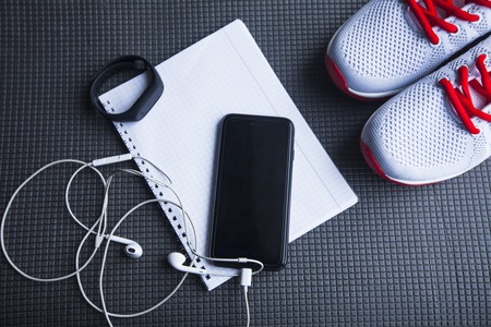 Gym stuff, blank space for exercise plan on white background