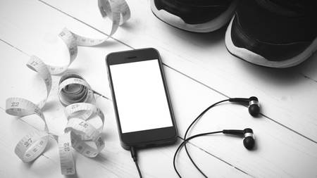 running shoes,measuring tape and phone on white wood table black and white tone color style