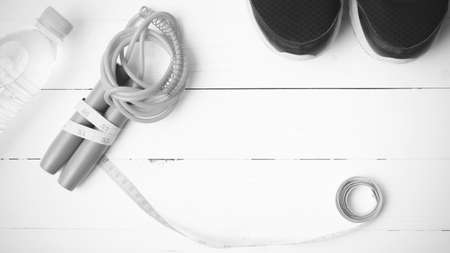 fitness equipment : running shoes,jumping rope,measuring tape and water bottle on white wood table black and white color tone style