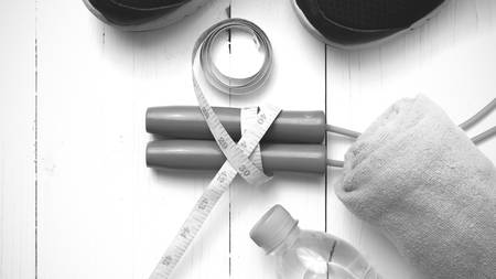 fitness equipment : running shoes,towel,jumping rope,water bottle and measuring tape on white wood table black and white color tone style