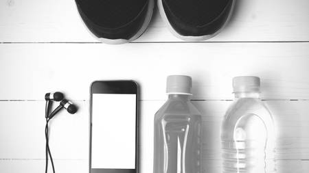 running shoes,orange juice,drinking water and phone on white wood background black and white tone color style