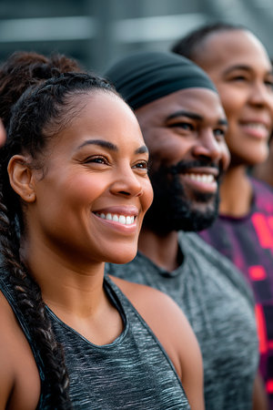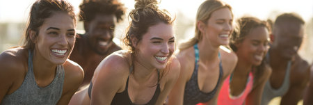 Group of young people in sports clothing encouraging each other while exercising outdoors : Generative AI