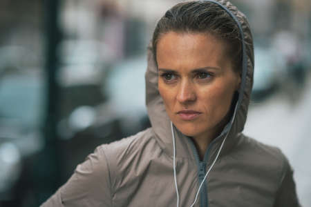 Portrait of fitness young woman in rainy city