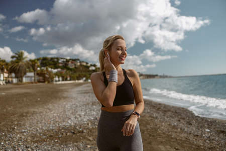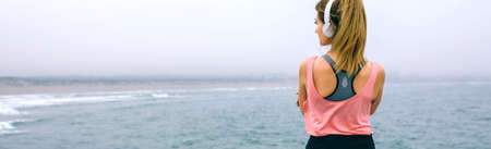 Back view of sportswoman with headphones watching the sea