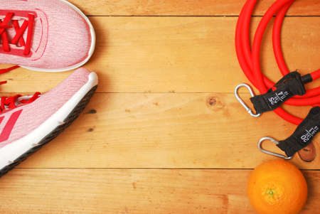 Red sports shoes, dumbbells, fitness rubber bands on purple sports mat. Workout concept.