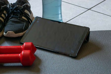 Exercise at home. Tennis, yoga mat, dumbbells and cell phone to exercise at home.