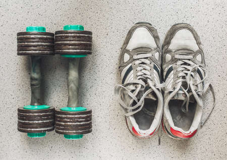 Vintage sport shoes and dumbbells on the floor, top view. Sport background