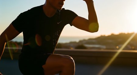 Silhouette of a man running in athletic gear during sunset on a road with lens flares and distant landscape.