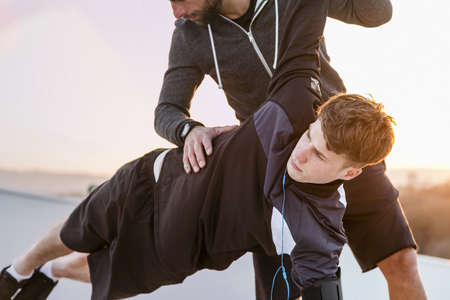 Mid adult man helping young man exercise