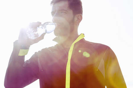 Mid adult man outdoors, drinking from water bottle