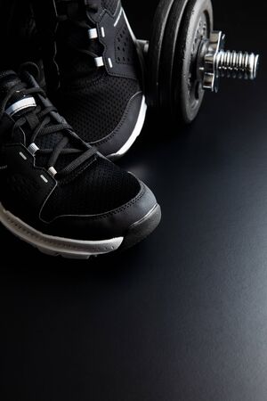 Fitness concept. Black sport shoes on black background.