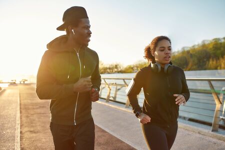 Starting new day from morning jog. Young african couple in sportswear jogging together on the bridge in the early morning