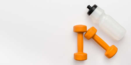 flat lay orange weights with water bottle copy space. High quality photo