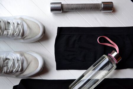 Sports items. Sport background. Sneakers, dumbbells, shirt and leggings on the white background.