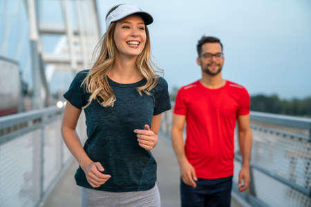 Early morning workout. Happy couple running across the bridge. Living healthy lifestyle.