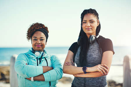 Get fit for the health of it. Portrait of two sporty young women standing on the promenade.