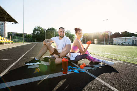Man and a woman sit in the stadium and laugh. Outdoor sports activities.