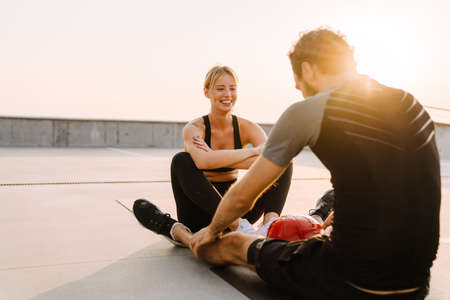 Young man and woman talking while working out together on sports ground outdoors