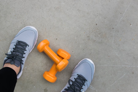 Fitness concept. Female legs in sports shoes on the floor with dumbbells. Space for text.