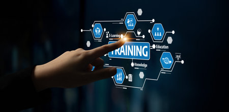 A business professional engages with a digital interface showcasing training and e-learning elements, highlighting a modern approach to skill enhancement and knowledge acquisition. Tessel