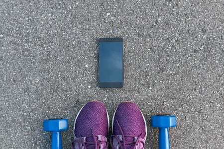 Smart sports gadgets. Cropped photo of dumbbells and purple sneakers