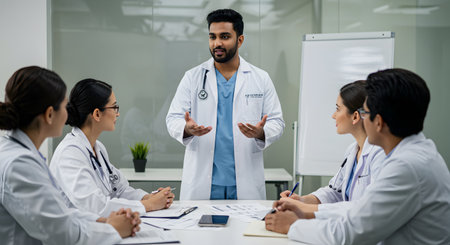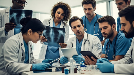 A group of multiethnic medical professionals including doctors, surgeons, and nurses are gathered in a hospital setting discussing patient care and using modern technology to address challenges in the medical field.