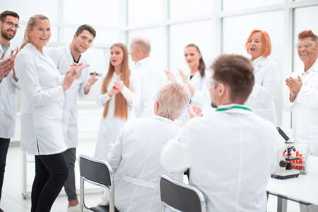 A team of doctors and a medical nurse applauding their colleague after a presentation in a meeting room