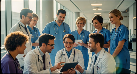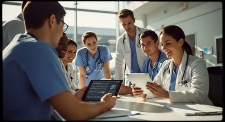 A diverse group of medical professionals, including doctors and nurses, gathered around a tablet, reviewing patient data in a modern hospital setting with a clean and sterile environment.