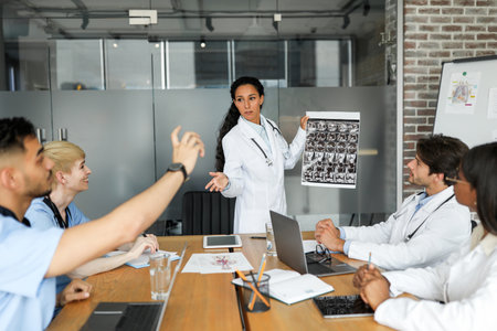 Online medical video conference in bright room, with a tv screen. Multiracial doctors sitting at the desk and discussing the CT of patient and consulting with African and Caucasian specialists online.